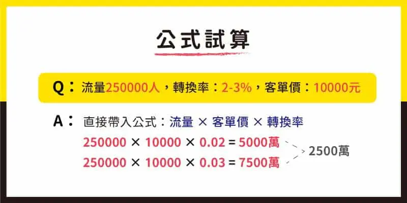其實以上兜兜轉傳都在追求流量,但是除了流量以外,該怎麼樣提升轉換率,也是一大重點!我們用上面流量的例子再來進行試算:
