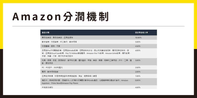 如果還是沒有想法那也可以參考亞馬遜的分潤制度,亞馬遜的分潤除了像下圖針對產品類別,同時也針對每一項行動比方說:註冊會員、宣傳影片……等等非常完善。