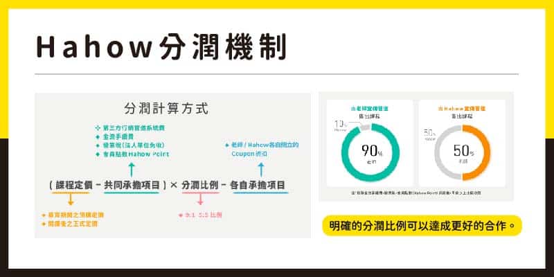 電商網站必須很清楚自己的行銷漏斗中每個流程的銷售轉換比例,這樣訂出的分潤比例,才有機會吸引到具有影響力的合作夥伴,成為電商網站強大的「外部行銷資源」。。拿Hahow來說,Hahow 與老師的分潤機制就是依每一筆訂單,透過哪一方的宣傳管道購買進行不同的「分潤比例」拆帳。
