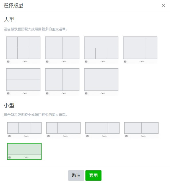 圖文選單的尺寸有兩種選擇,分別是「全尺寸」和「半尺寸」: