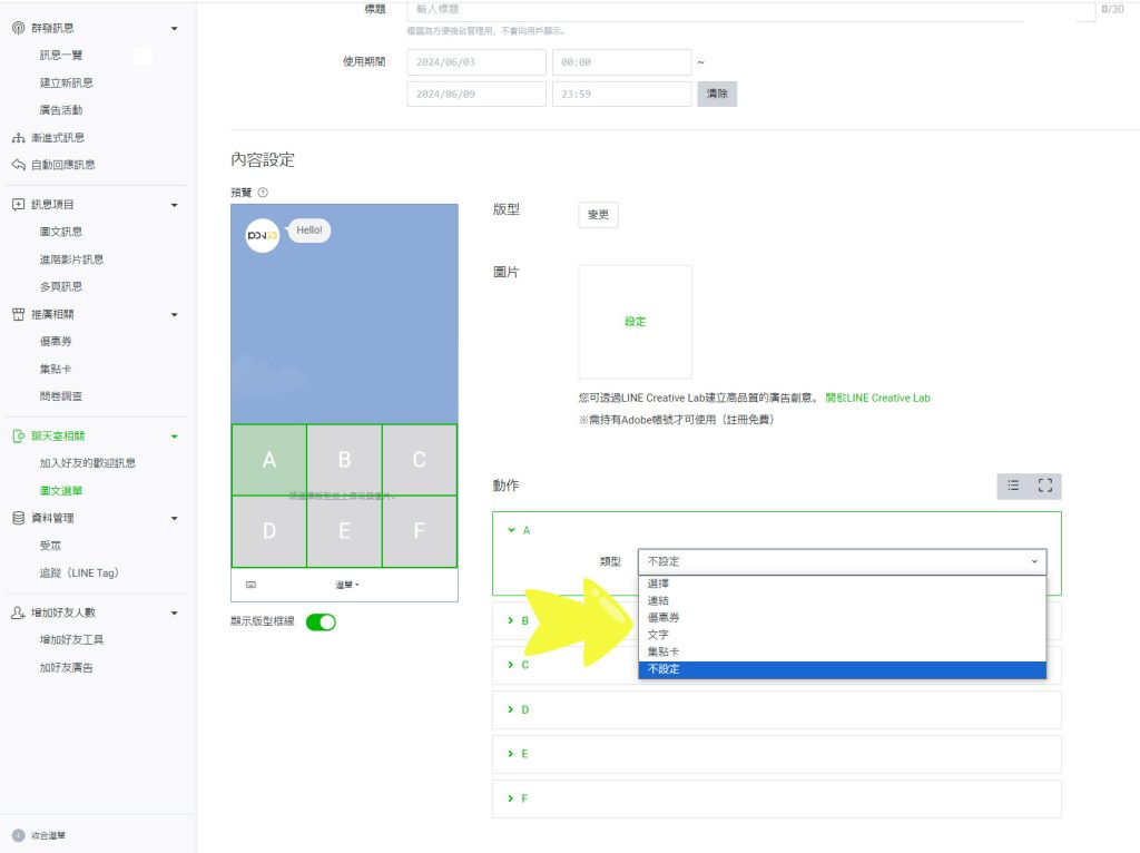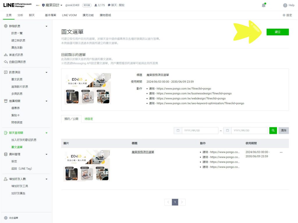進入圖文選單頁面後,點擊「新增」按鈕,開始建立一個新的圖文選單。在彈出的窗口中,填寫一些基本資訊,例如名稱、大小和佈局。