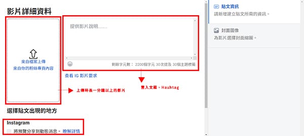 步驟2:IG影片設定介面與動態消息不太一樣,除了初步的文案、Hashtag以及影片外,還可以決定要不要將IG影片前60秒的預覽放置於Instagram動態消息。