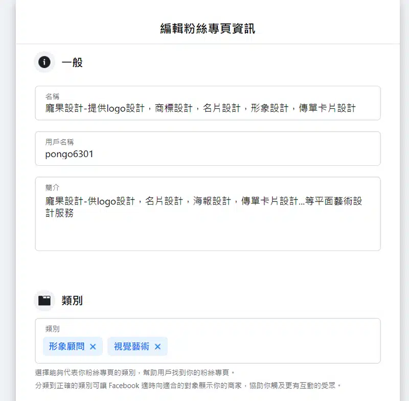 這個部分填寫完「粉絲專頁名稱」、「類別」及「說明」,第二步驟就完成50%了。但其中要特別注意的是類別的選擇,選擇與業務項目相似的類別,才能讓Facebook能更好的曝光社群貼文給目標消費者。