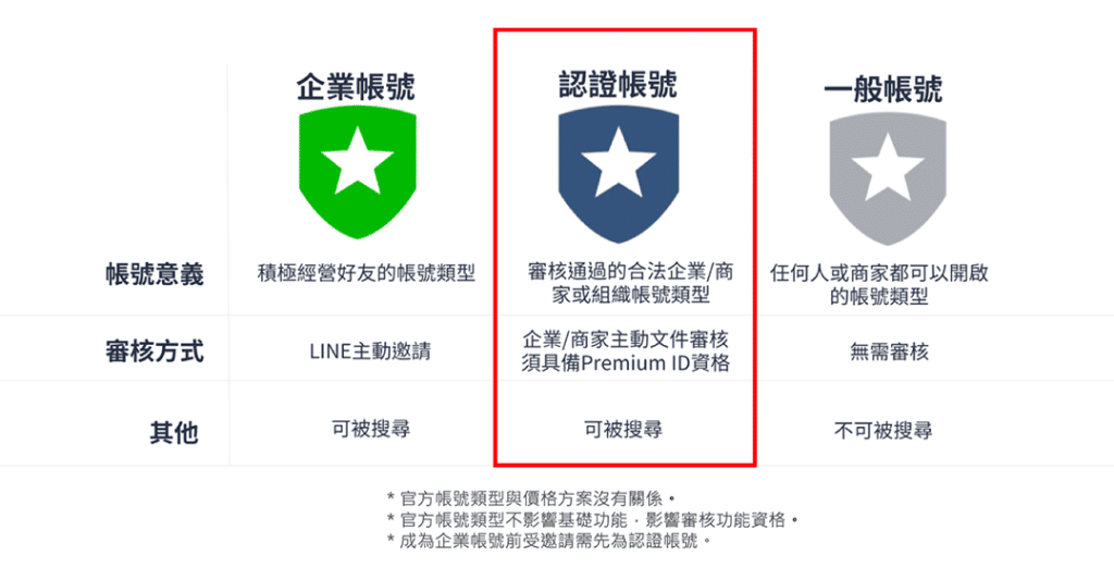 你可以先看一下LINE官方的帳號盾牌分別,灰色盾牌就是一開始我們申請官方帳號獲得的,綠色與藍色盾牌都屬於認證帳號,只有LINE認證帳號才能被直接用商家企業名稱搜尋到,一般帳號只能用基本ID加好友的方式找到官方帳號。