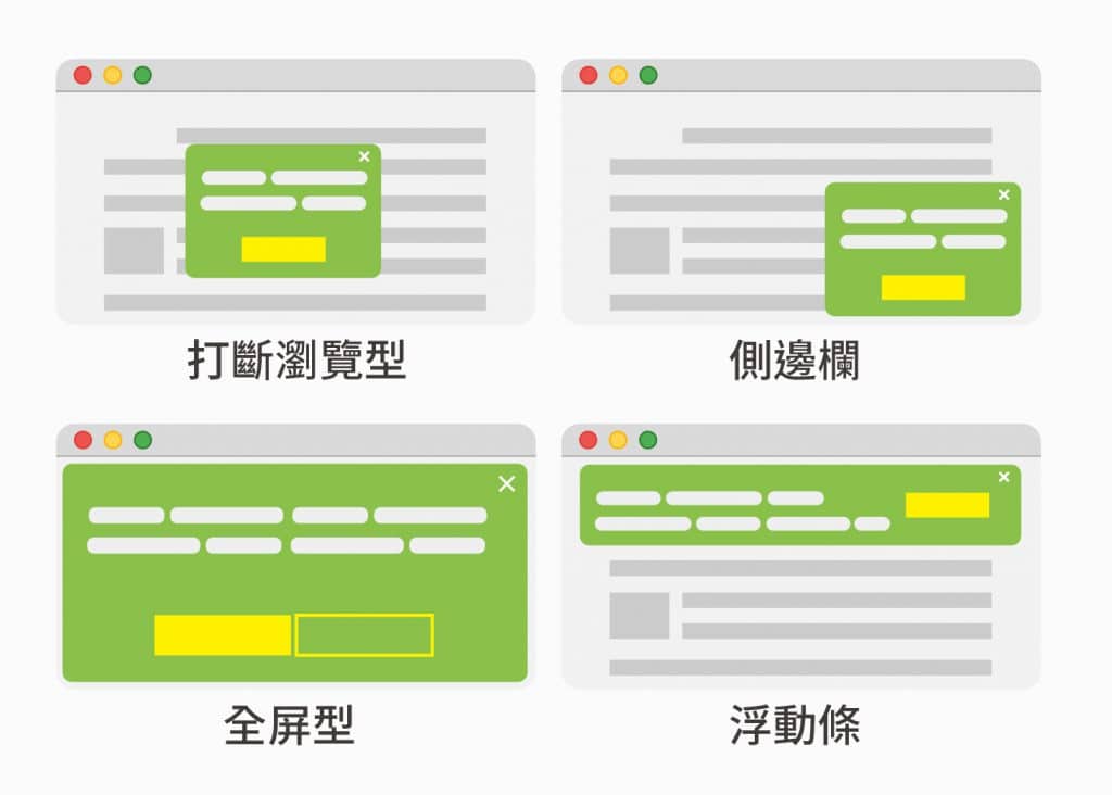 彈跳視窗的位置其實是有講究的,一般直接置於網頁中央的,都算打斷瀏覽的類型,優勢就在於不會讓使用者錯過,能第一時間了解網站內部的優惠或資訊,還有另一種沒有打斷閱覽,但存在感很強的彈跳視窗,它不會干擾你閱覽網頁,但會慢慢霸占整個網頁。