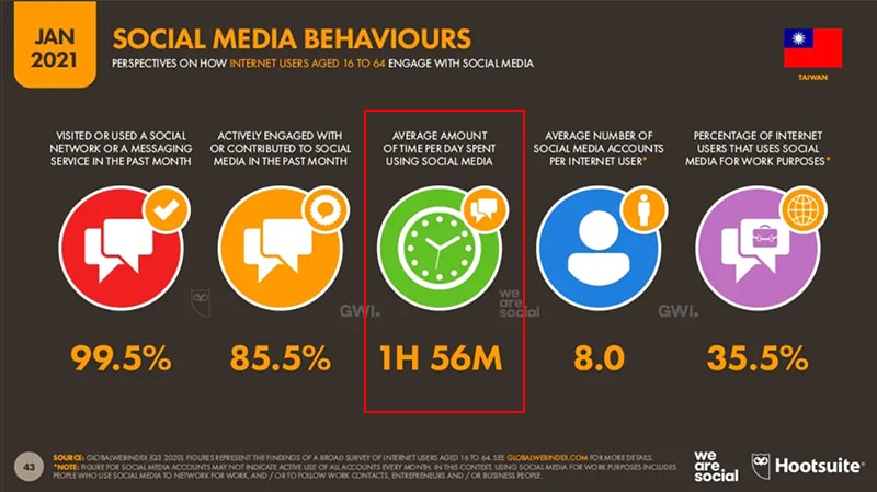 在台灣每個人平均每天使用手機2-4小時以上,社群就佔這些時間的一大部分,不只讓手機使用者掌握資訊,更是一種社交關係的維繫與連結。在商業或聚會上也無法離開社群,可能在交談的最後,互相加個LINE或是建個群之類的,讓彼此掌握彼此的訊息,甚至是擴展自己的人脈;在學校互相分享生活日常或是討論功課;在網路上看到有吸引力的話題加入討論等等。我們的日常生活中已離不開社群媒體,和家人、朋友、同學、甚至不認識的人都會在社群上相遇互動或是討論話題,社群成為互相聯繫的一個重要渠道。