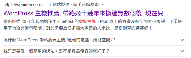 在常見問題或是內容延伸中使用結構化標記,能夠在主標題的下方增加下拉式選單,不僅僅使用範圍廣泛,版面呈現明顯易懂,也可以讓使用者直接在搜尋頁面上看到標記過的問題與答案,因此是許多商家或是品牌愛用的標記方式。