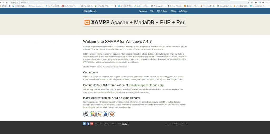 接著開啟瀏覽器,並將網址輸入 127.0.0.1 ,若是可以看到這個畫面,就是安裝成功了 。