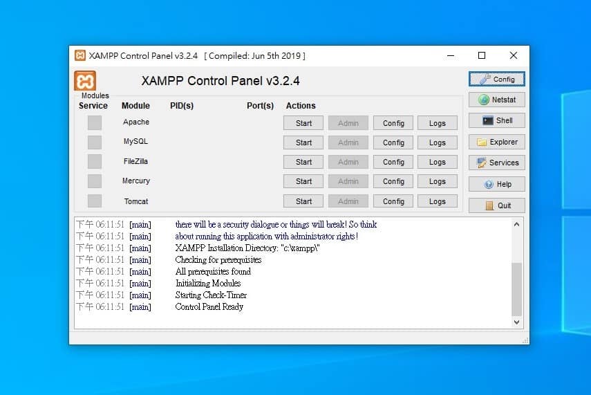 在這個視窗將 Apache和MySQL打勾,下一次XAMPP執行時,這兩個程式就會自行啟動。
