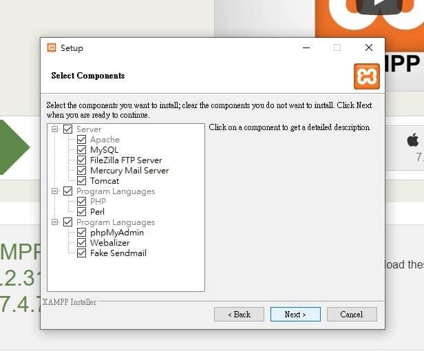 選擇所需要的架站功能,這一部分預設是全部選取,我們也別進行調整,接著點選Next> 進入下一個畫面。
