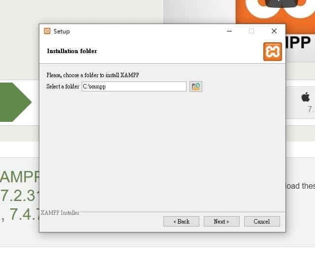 選擇安裝的目標磁碟槽,預設為C槽,為了確保XAMPP能夠完整運作,這邊就不再進行更改磁碟槽;點選Next> 進入下一個畫面。