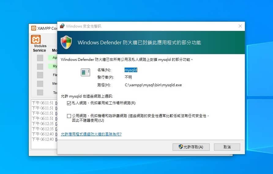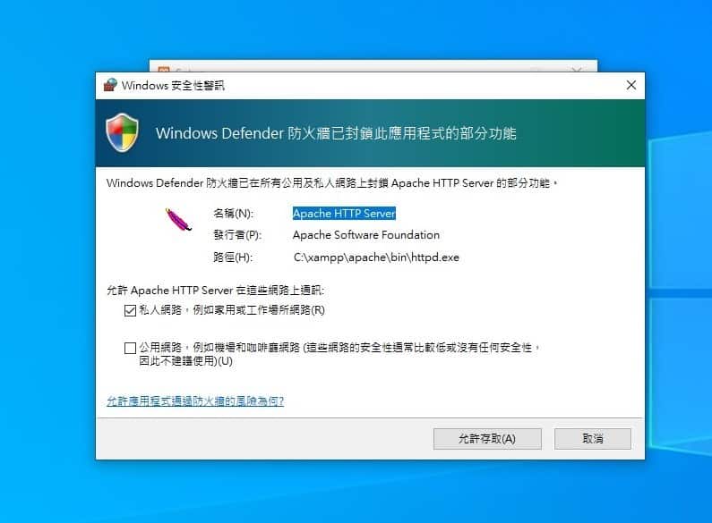 開啟XAMPP程式,會跳出 Apache 安全警示視窗,選擇允許存取。