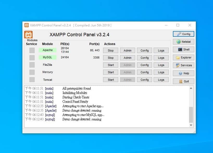 此時會看到 Apache 和 MySQL 亮起綠燈,這就表示這兩個程式已經開始作用;