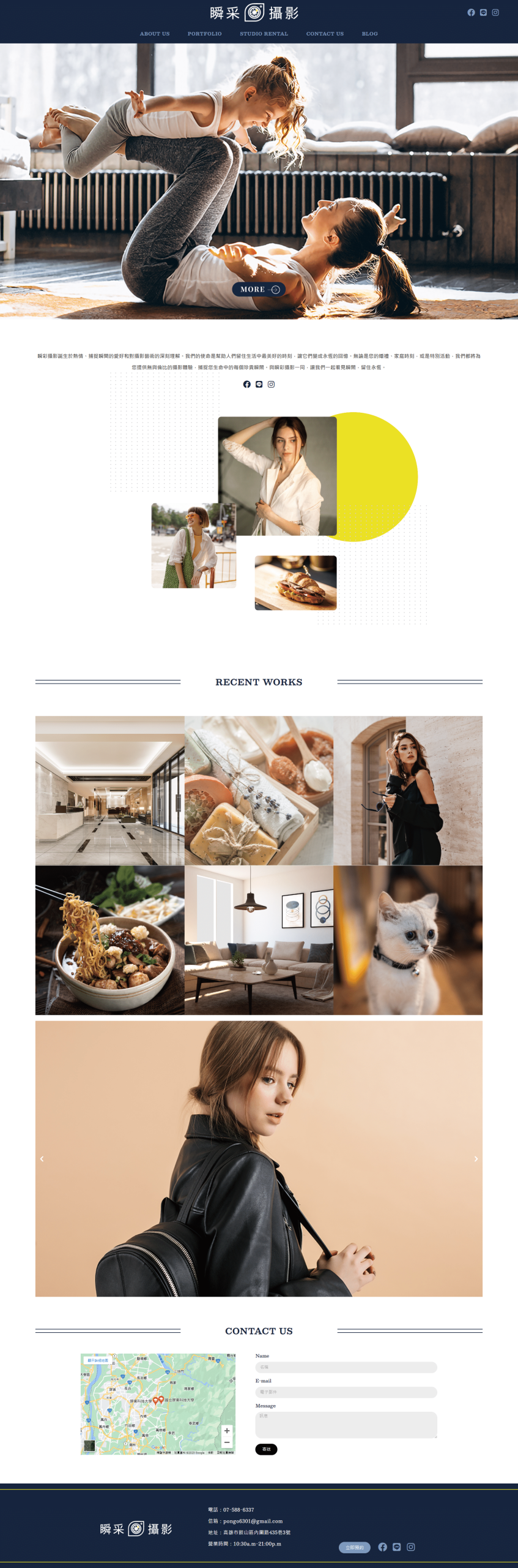 最後,首頁下方的聯絡表格,為用戶提供了一個方便的溝通渠道,無論是提問相關問題還是預約拍攝,都能迅速而方便地進行。這樣的設計不僅增強了用戶與品牌之間的互動,也提升了網站的服務功能。