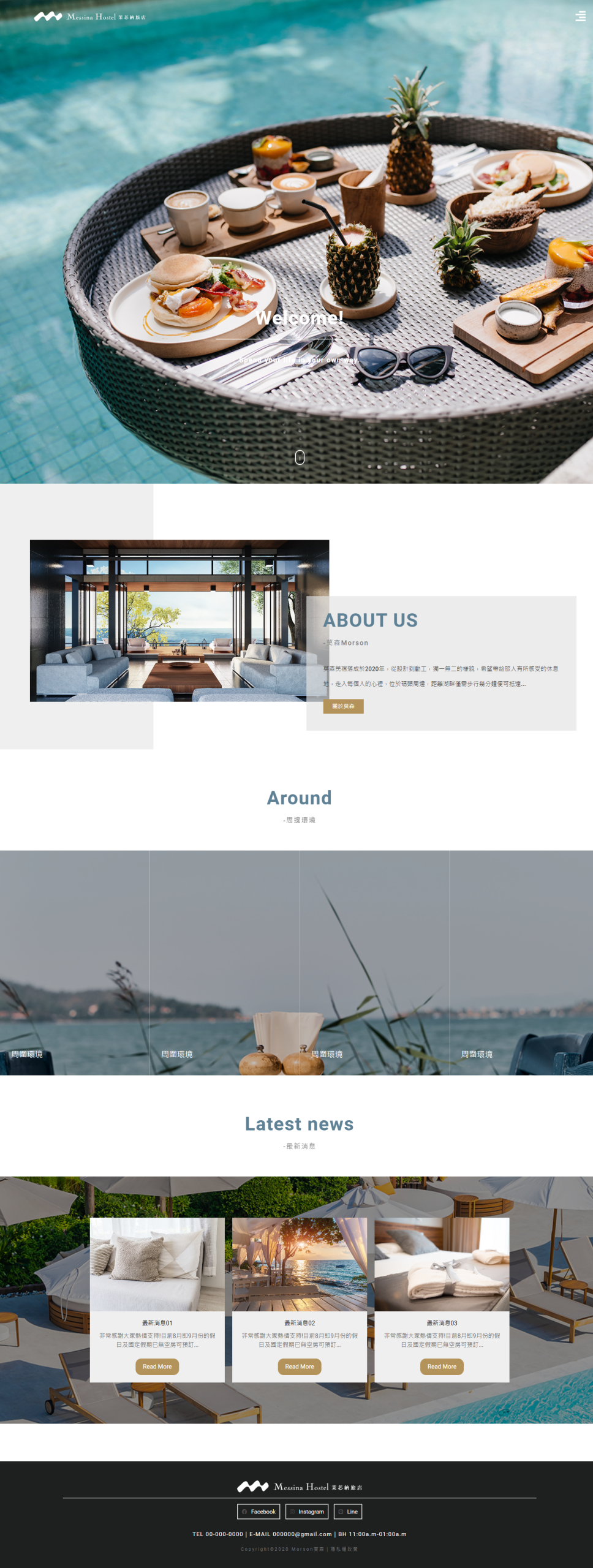 網站底部設有品牌的聯絡方式和社群媒體圖標,方便用戶直接通過網頁進行電話預約或連結至民宿的社群媒體頁面。這種設計不僅方便了用戶的溝通和互動,也有助於提升品牌的曝光度和用戶參與度。