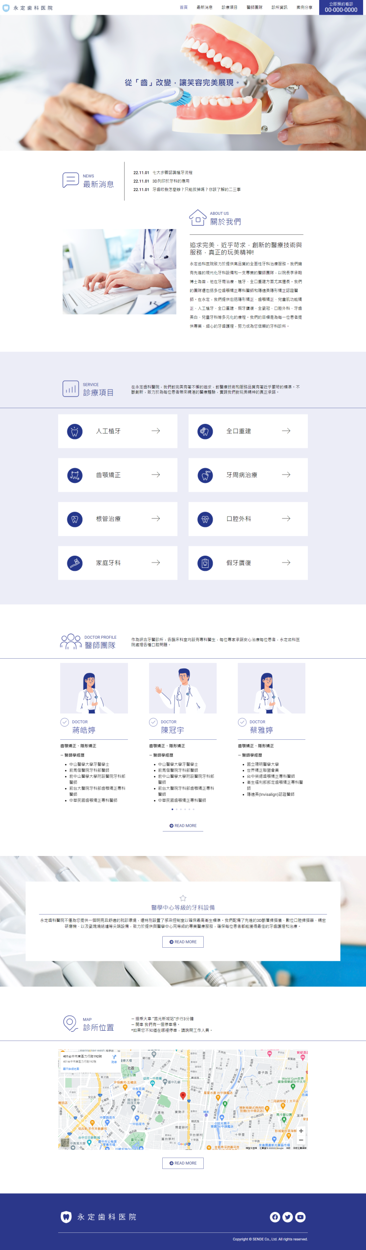 首頁中醫療團隊的介紹部分,通過清楚標示的成員照片以及各自的專業領域和經歷,進一步提升了用戶對品牌的信賴感。提供的地圖功能,使瀏覽者可以通過滑動和縮放輕鬆找到目的地。
