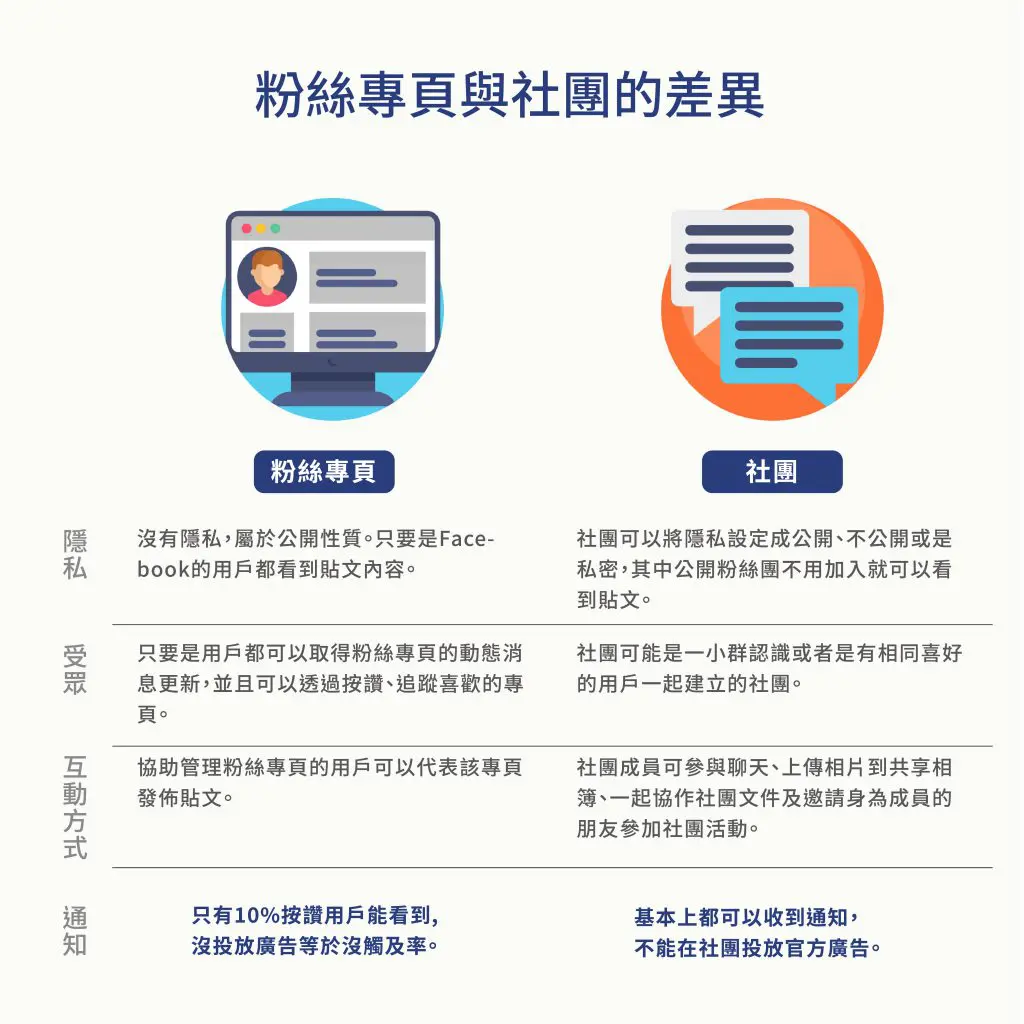 不過要注意的是Facebook演算法會對內容進行優先排序,家人與朋友的貼文會優先佔據使用者的首頁,所以必須創造話題、熱度,讓使用者主動分享貼文,令貼文仍然擁有較高的優先顯示順序。在Facebook有兩種方式可以用來拓展品牌知名度分別是粉絲專頁、社團。